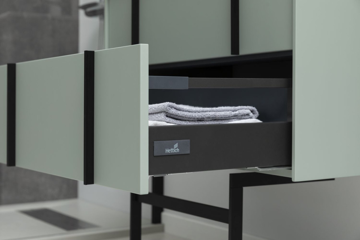 Выдвижные ящики с металлическими боковыми стенками в цвете серый металлик.
