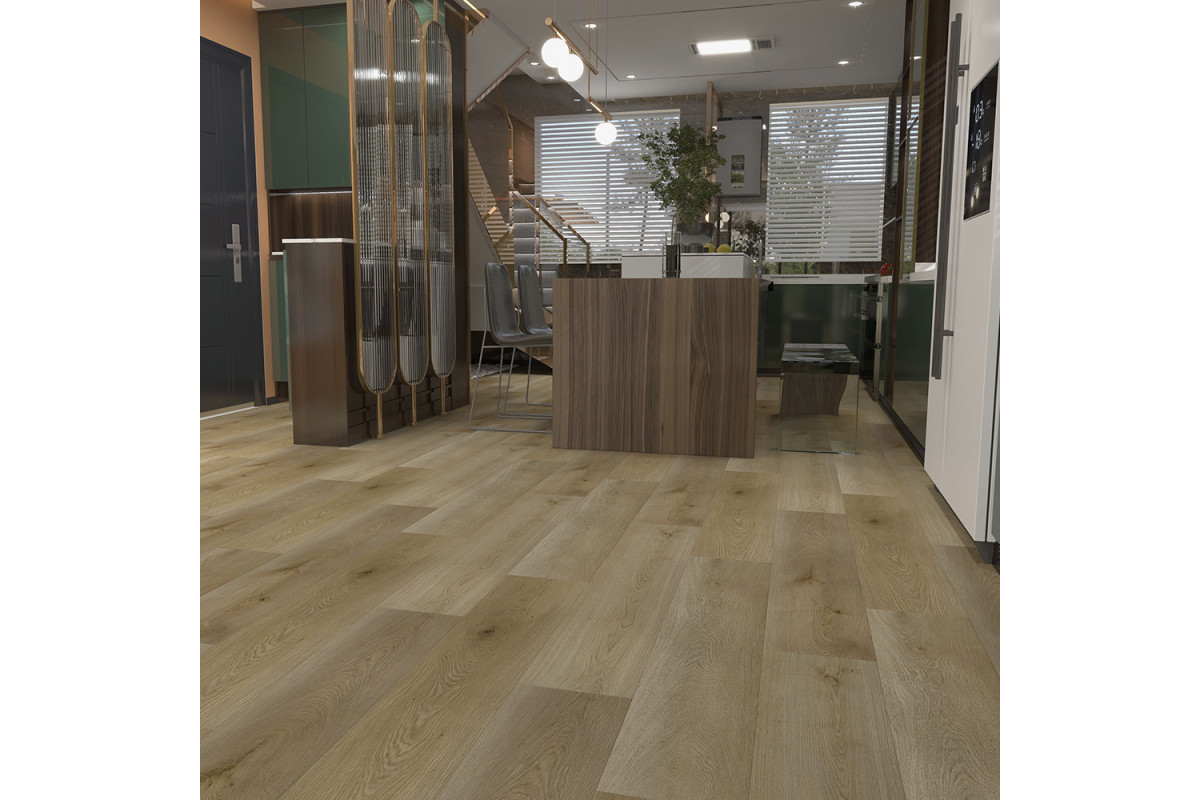 Floorwood Quantum — коллекция винилового ламината на основе SPC (каменно-полимерный композит состоит на 70-80% из перемолотого известняка и ПВХ, смешанных при высокой температуре. Не боится воды, не реагирует на перепады температур. За счет высокой плотности материала, сопоставимой с камнем, отличается безупречной прочностью замков. Поскольку в составе нет клея и смол, материал абсолютно безопасен для человека. Каменно-полимерный ламинат Floorwood Quantum со встроенной подложкой 43 класса можно использовать в домашних, коммерческих или промышленных помещениях. Возможно использование в ванных комнатах с герметизацией зазоров по периметру помещения, чтобы вода не затекала под напольное покрытие.